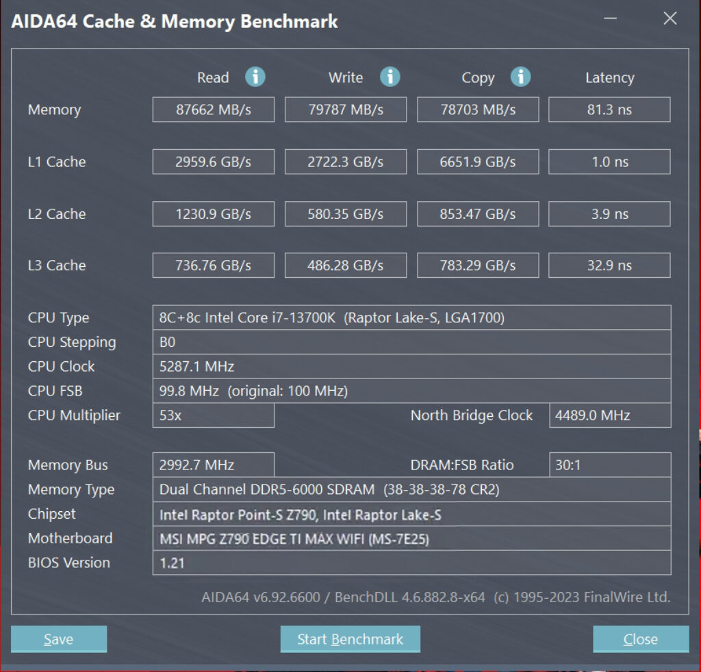 First, let’s test the 6000 MHz (Profile 2) in XMP mode. The timing is set to 38-38-38-78. At this configuration, the reading speed reaches 87,662MB/s, and the writing speed is 79,787MB/s. The copy speed registers at 78,703MB/s, with latency dropping to 81.3ns.