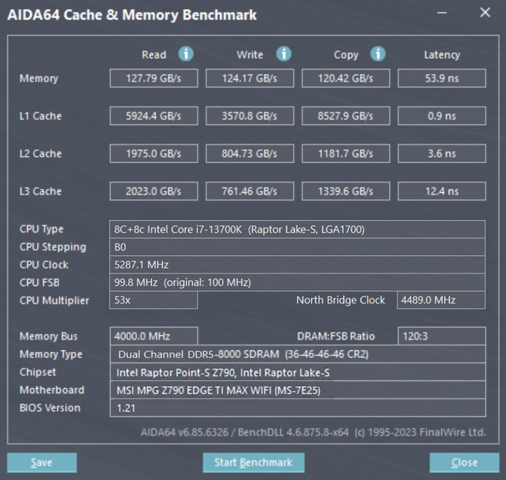 Don’t think that 7600 MHz is the limit of T-FORCE XTREEM DDR5 memory. After pushing the manual overclock to 8000 MHz, performance sees a significant boost, with read speeds reaching 127.89 GB/s and write speeds hitting 127.17 GB/s. Copy speeds also peak at 120,42 GB/s, while latency drops to 53.9ns.