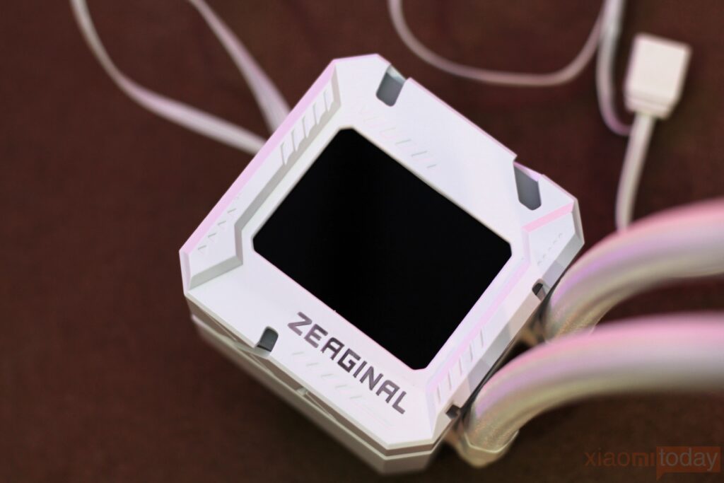 The top cover of the Zeaginal ZC-ZEUS XT360 cooler head boasts a sophisticated design, featuring a 2.4-inch LCD screen positioned centrally. Along the sides of the head, there are intricate RGB light strip configurations that are capable of supporting ARGB lighting effects and synchronization with compatible motherboards, which support 5v three-pin divine light synchronization. This combination of advanced features enhances both the aesthetic appeal and functionality of the cooler, providing users with customizable lighting options and real-time monitoring capabilities.