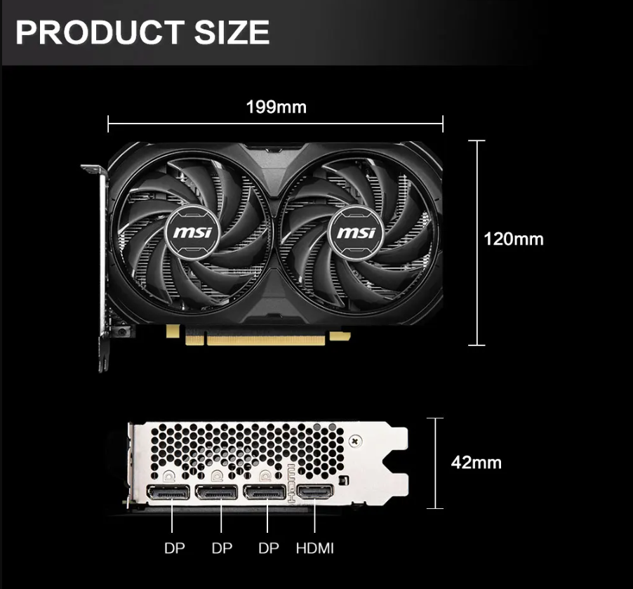 The RTX 4060Ti VENTUS 2X sports a minimalist yet striking black design that will complement any build. The compact dimensions of 199 x 120 x 42 mm make it suitable for a wide range of PC cases, while its weight of just 546 grams ensures it doesn’t add unnecessary bulk. The card features a dual-fan cooling system that not only enhances its aesthetic appeal but also plays a crucial role in maintaining optimal temperatures during heavy usage. This attention to thermal management ensures that the card remains efficient and reliable even under intense gaming sessions.