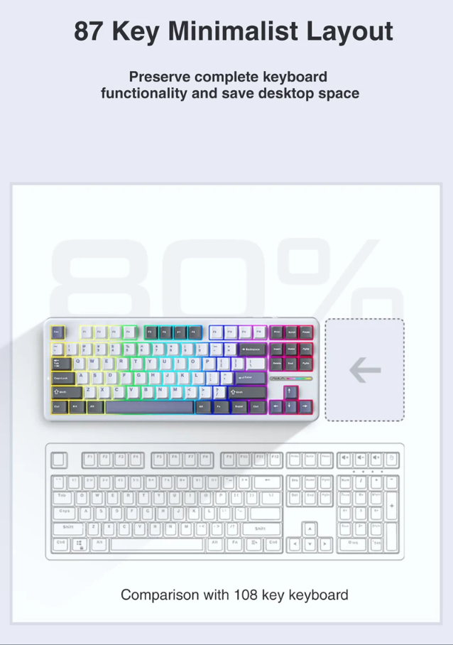 When it comes to connectivity, the AULA F87 offers flexibility with both wired and wireless options. Choose from the Tri-Mode Version, which supports Bluetooth 5.0, 2.4G wireless, and Type-C wired connections, ideal for users who switch between multiple devices or opt for the Wired Version for a simple Type-C wired connection. In terms of specifications, the F87 features PBT plastic keycaps, hot-swappable switches, and a multicolor backlight. While it may not be a full-size keyboard, it packs all the functionality you need for efficient typing.