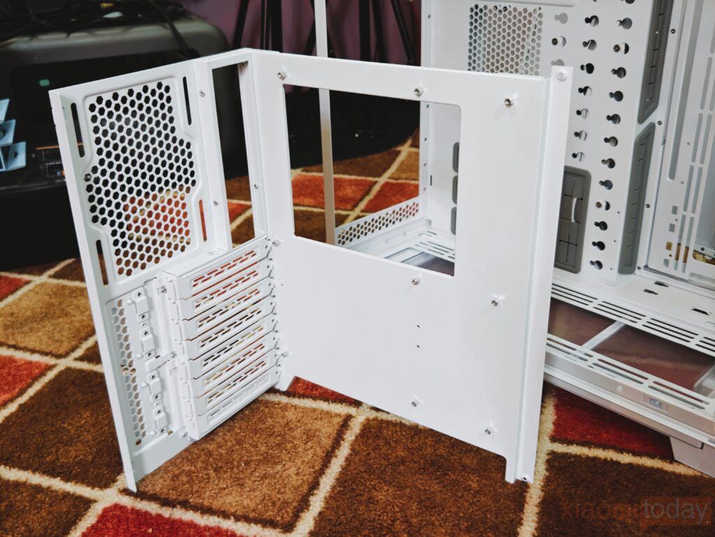 The mainboard tray in the housing showcases Lian Li’s meticulous engineering with its intricate, multi-layered design. Its clever construction allows for easy detachment, streamlining motherboard installation effortlessly. Moreover, its adaptable mounting heights cater to diverse preferences and requirements, demonstrating Lian Li’s commitment to flexible and user-friendly design.