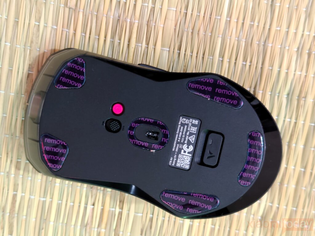 The mouse is equipped with six anti-slip pads strategically placed on its bottom surface — at the front, back, left, right, and middle — ensuring exceptional stability during daily use. A physical red button located on the underside allows for easy adjustment of the polling rate. Additionally, Below is a magnetic wireless receiver storage compartment, which contains a 4K wireless receiver. It is small in size and easy to carry.