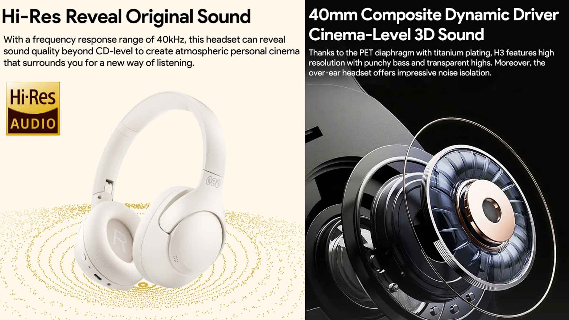 - Hi-Res Audio and 3D Sound: The QCY headset supports Hi-Res Audio, which means they can deliver CD-quality sound with a 40kHz frequency response. They also have a 40mm Composite-Diaphragm with Titanium Plating, which offers cinema-level 3D sound, combining punchy bass and transparent highs for an immersive audio experience.