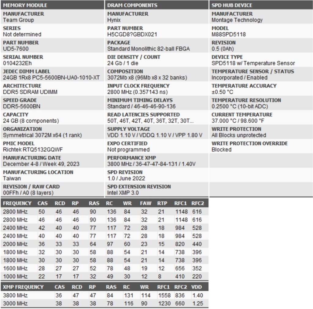 Using Thaiphoon Burner software, we examined the parameters of the TEAMGROUP T-FORCE XTREEM DDR5 memory and its components. The software revealed that these modules were produced between December 4-8, 2023, with memory chips manufactured by Hynix. The T-FORCE XTREEM DDR5 features an Intel XMP 3.0 profile with a frequency of 7600 MHz, a voltage of 1.40V, and timings of 36-47-47-84-131. In addition to supporting Intel XMP 3.0, it also supports AMD EXPO one-click overclocking.