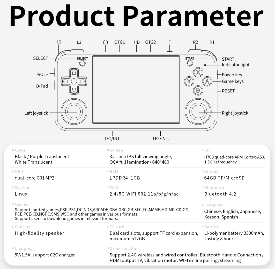 - High-Resolution Screen: The 3.5” IPS screen provides a bright and sharp display, bringing your games to life with vivid colors and clear details.